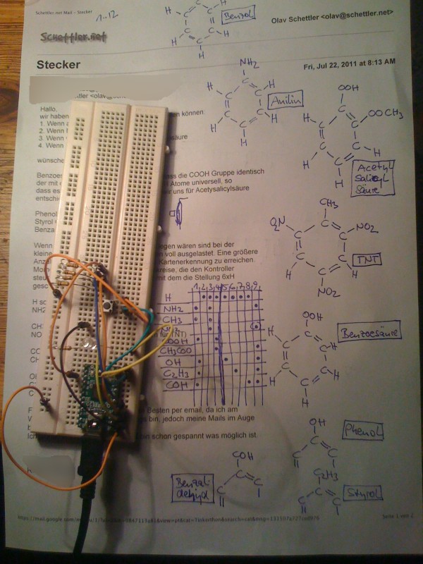 The new control hardware for the Benzene Table is implemented based on a Teensy 2 board and programmed using the Arduino IDE. Visitors can exchange hydrogen atoms with other molecules and get shown videos of the substances thus created. The molecules are interfaced with the Teensy through nine reed switches each. The video player is controlled through infrared signals. German writeup includes schematics and full source code.
