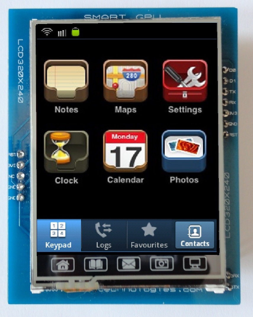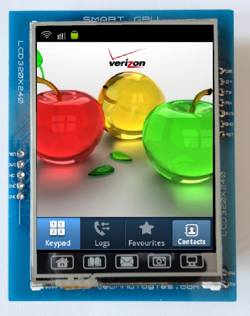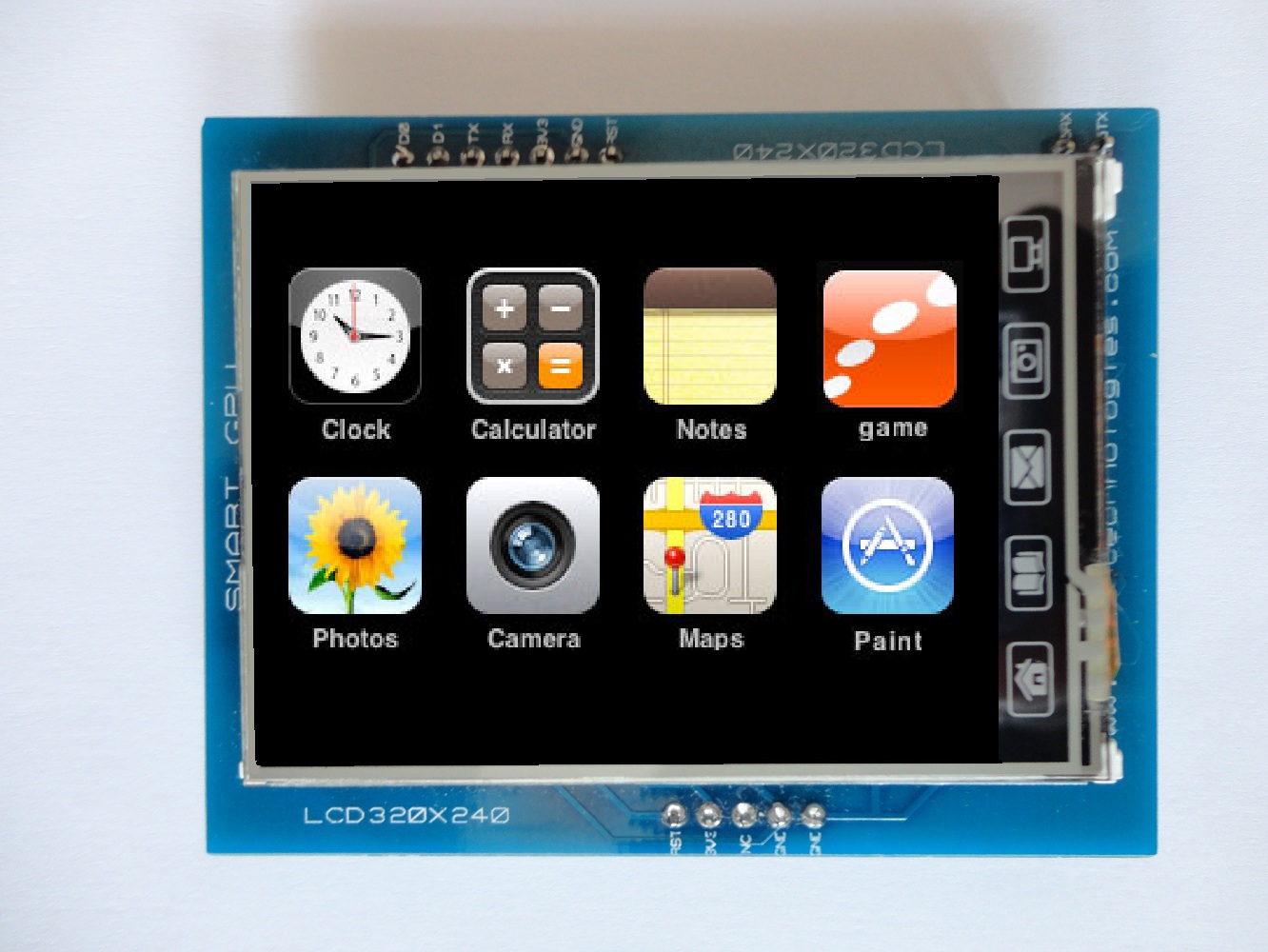 With just an Arduino and the SMARTGPU we created, an Smartphone like application very easy, thanks to the graphics processor of the SMARTGPU. We loaded the images on the microSD card with FAT(windows) format supported by the SMARTGPU.