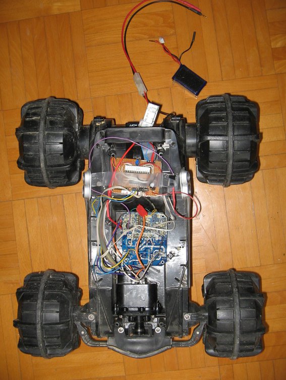 connected a $10 bluetooth module to arduino's serial port and wrote a python script with SL4A for my android phone. The android-app sends a byte 4 times per second. The car stops automatically when it does not get a command for 1 second. The car has 2 motors and 6 relais for changing direction an 2 different driving speeds.