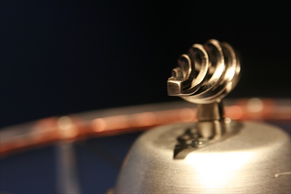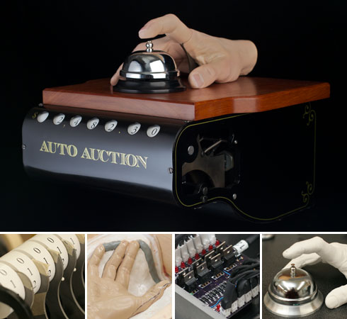 Auto Auction is a sculpture that automatically sells itself. Turn on the machine and it will open an online auction and offer itself for sale. A sculptural hand with articulated finger taps a bell to announce each new bid. Ratchets mechanically advance seven tumblers showing the current bid price.