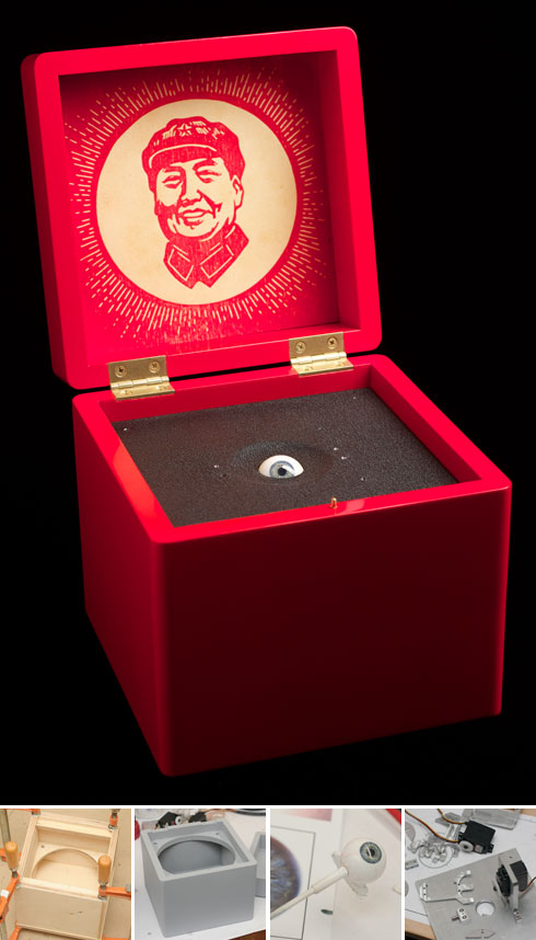 A polished red box with the Chinese Communist Party symbol contains a wood block print of Chairman Mao Zedong and a nervously searching blue eye.