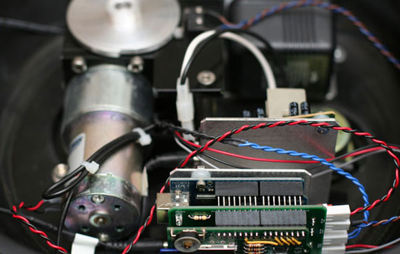 The sculpture is controlled by an Arduino Duemilanove. Stepper motors are driven by three Pololu A4983 Stepper Motor Driver Carriers.