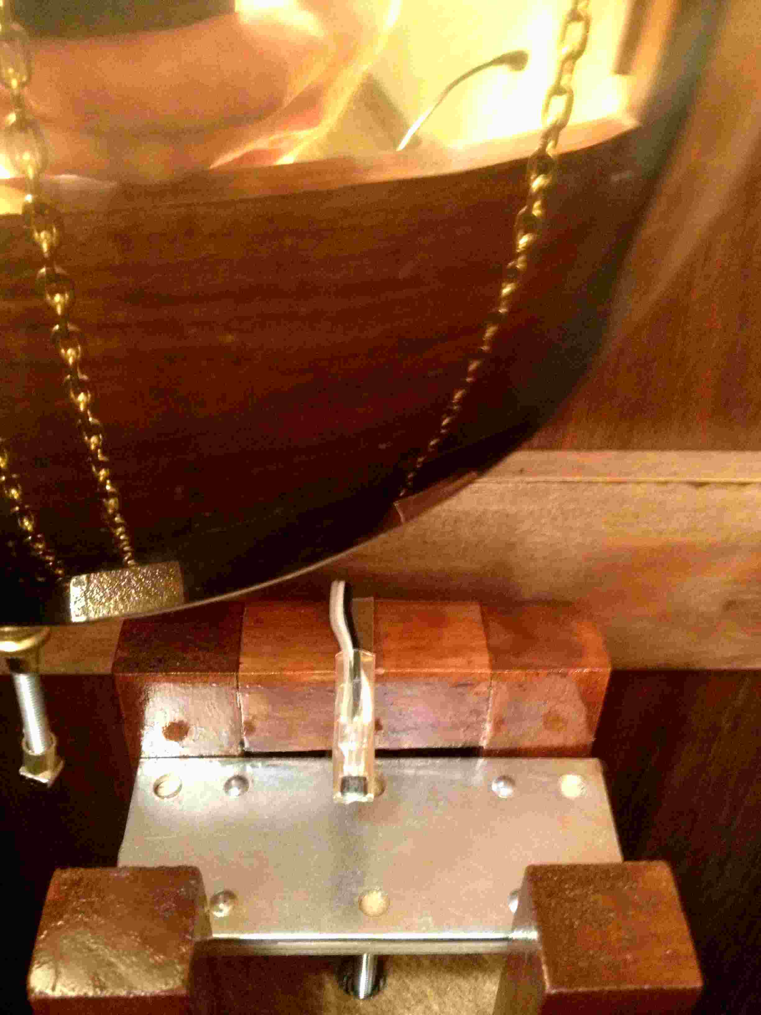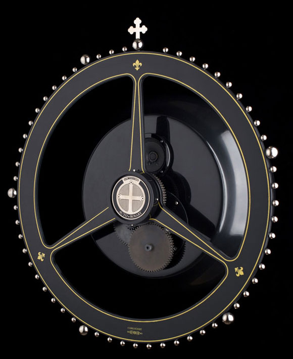 Touching the center medallion prompts this machine to begin praying. The 22-inch diameter spoked wheel has 59 nickel plated brass balls strategically placed about its perimeter and indexes 1/60th of a revolution (one ball) after each prayer. One full revolution equals one rosary. Tap the center button 20 times on your way to work in the morning, and the machine will methodically pray 20 rosaries for you while you toil away at the office.