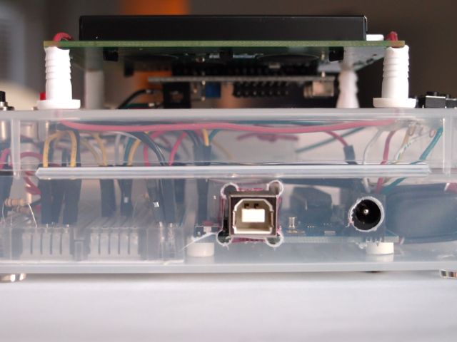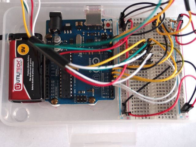 My son and I used a Radio Shack Sidekick box as the housing. We bolted the Arduino Uno onto it using short plastic standoffs, and cut holes to access the USB port and power jack. An external umbilical connects the 9V battery, or you can attach an external power supply.