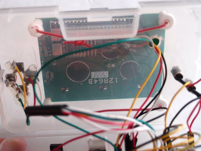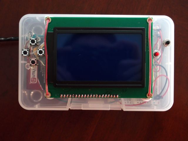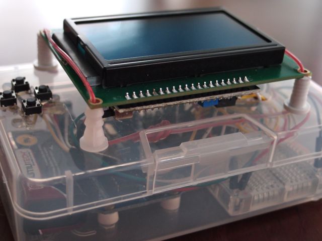 The SainSmart 12864 GLCD is mounted on top using standoffs. We used the serial header as described in Brad's *duino blog: