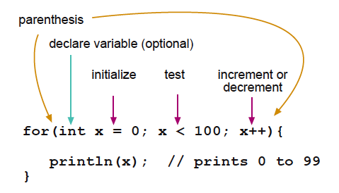 The for statement is used to repeat a block of statements enclosed in curly braces. An increment counter is usually used to increment and terminate the loop. The for statement is useful for any repetitive operation, and is often used in combination with arrays to operate on collections of data/pins.