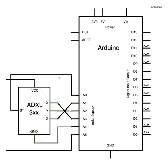 The ADXL3xx outputs the acceleration on each axis as an analog voltage between 0 and 5 volts. To read this, all you need is the analogRead() function.