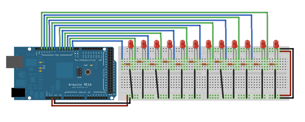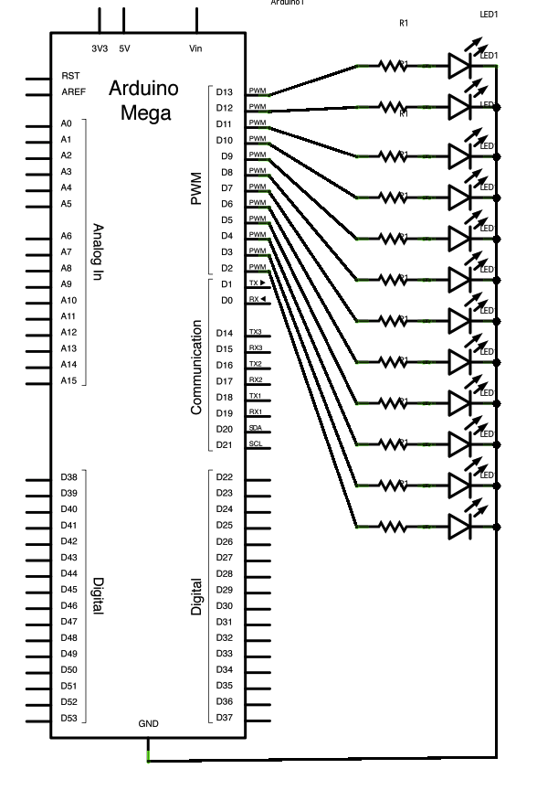 * LEDs attached from pins 2 through 13 to ground.