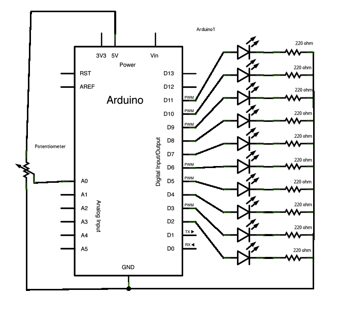 The bar graph - a series of LEDs in a line, such as you see on an audio display - is a common hardware display for analog sensors. It's made up of a series of LEDs in a row, an analog input like a potentiometer, and a little code in between. You can buy multi-LED bar graph displays fairly cheaply, like this one. This tutorial demonstrates how to control a series of LEDs in a row, but can be applied to any series of digital outputs.