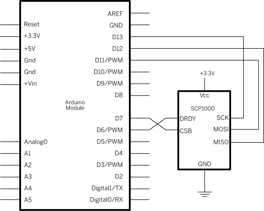SCP1000 sensor attached to pins 6, 7, 10 - 13: