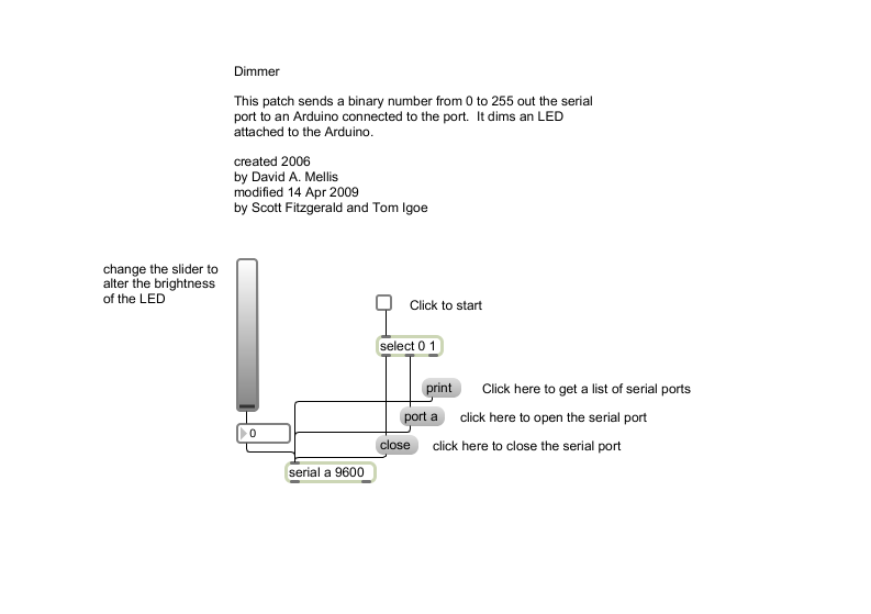 The Processing sketch in the code sample above will send bytes out the serial port to the Arduino to dim the LED.
