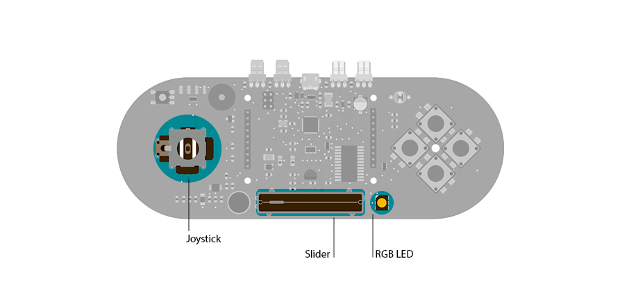 The joystick has two axes, X and Y. Each axis controls a color of the RGB LED: red with the X-axis, and green with the Y-axis. The brightness of the blue element will be controlled by the position of the linear potentiometer.