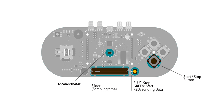 To start sampling, press the direction down push-button. This begins communication as a keyboard with the computer. Changing the position of the linear potentiometer will change the rate at which samples are read from the accelerometer and written to the computer.