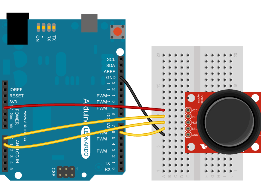 Connect your Leonardo board to your computer with a micro-USB cable. The pushbutton is connected to pin 6. If you're using a part like the Joystick shield pictured below, you may not need a pulldown resistor. The x-axis on the joystick is connected to analog in 0, the y-axis is on analog in 1.