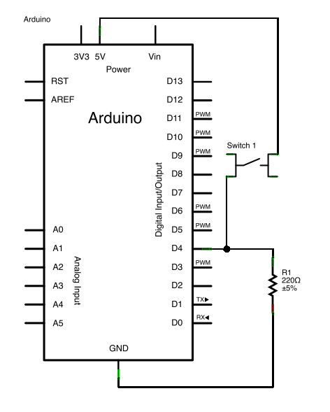 Attach one end of the pushbutton to pin 4 on the Arduino. Attach the other end to power. Use the resistor as a pull-down, providing a reference to ground, by attaching it from pin 4 to ground.