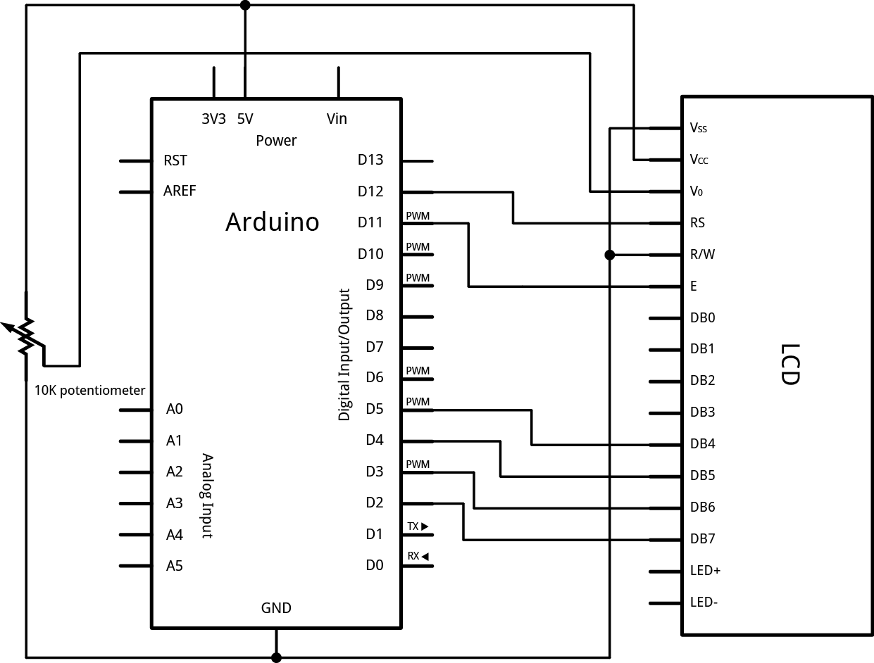 The Hitachi-compatible LCDs can be controlled in two modes: 4-bit or 8-bit. The 4-bit mode requires seven I/O pins from the Arduino, while the 8-bit mode requires 11 pins. For displaying text on the screen, you can do most everything in 4-bit mode, so example shows how to control a 2x16 LCD in 4-bit mode.