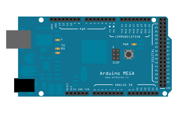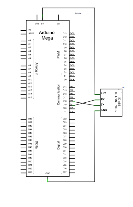 After checking the data sheet of whatever serial enabled device you choose to use for this example, make sure that it is both properly wired and powered. Connect the RX pin and TX pins of your device to the TX and RX pins of your Mega, as shown in the schematic below.