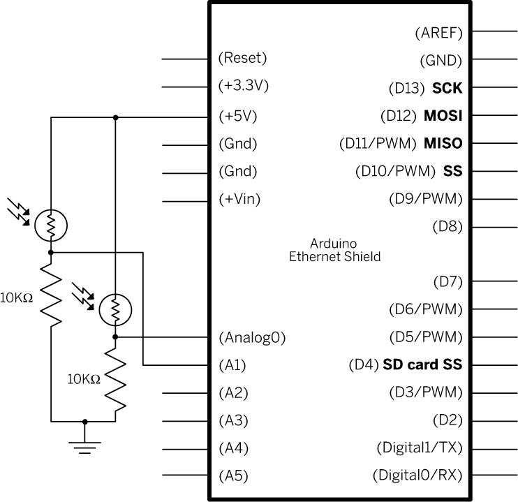 Pictured: Two CDS photocells with 10k ohm pull down resistors on analog pins 0 and 1.