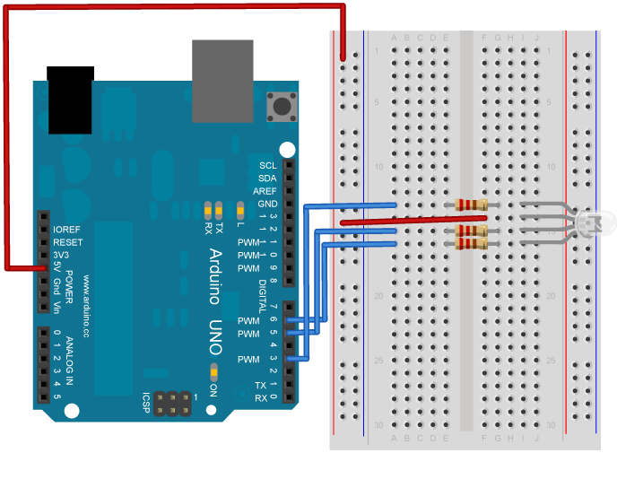 With your remaining wires, connect your red cathode to pin 3, green cathode to pin 5, and blue cathode to pin 6 in series with the resistors.