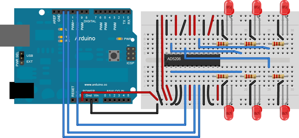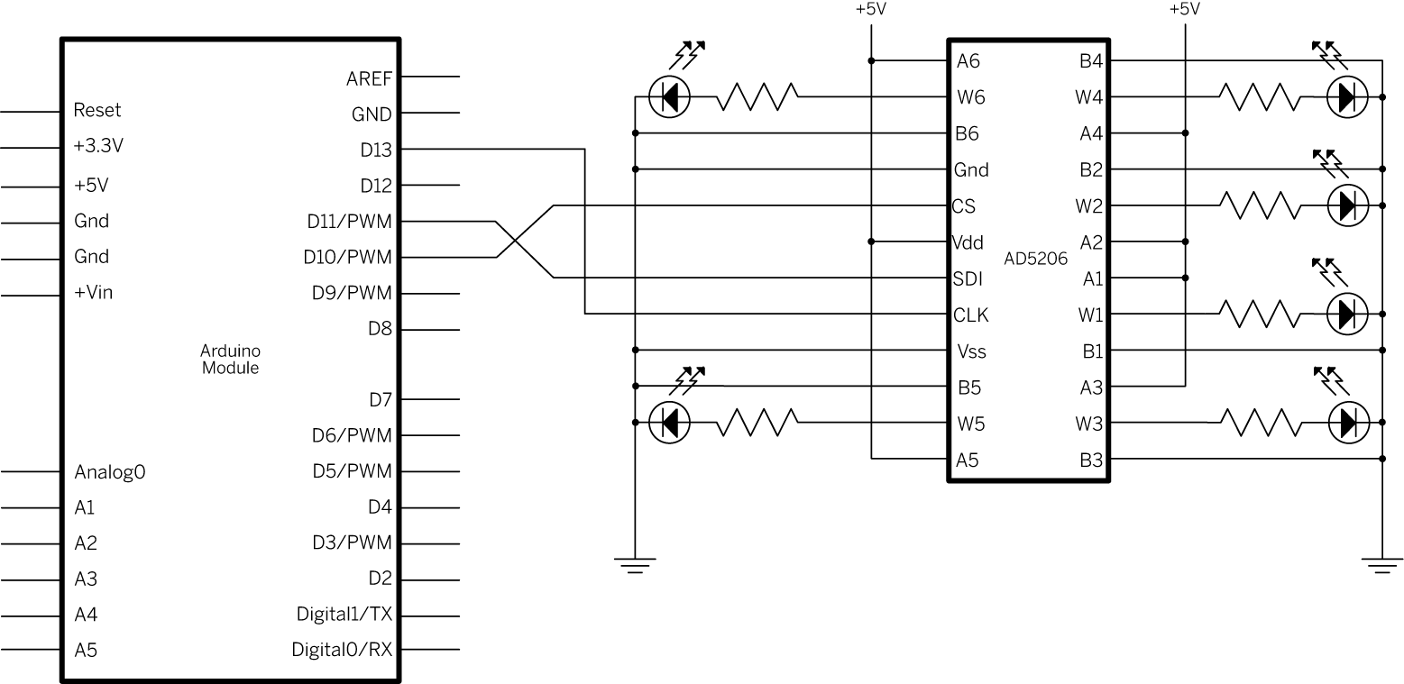 This example controls an Analog Devices AD5206 digital potentiometer.