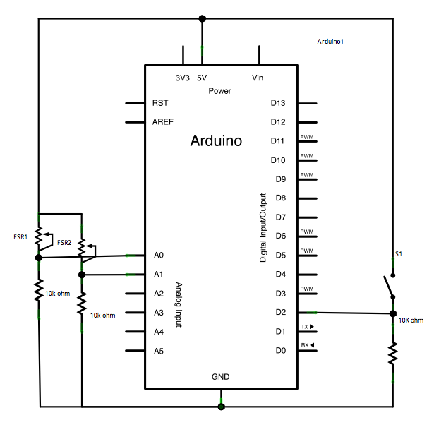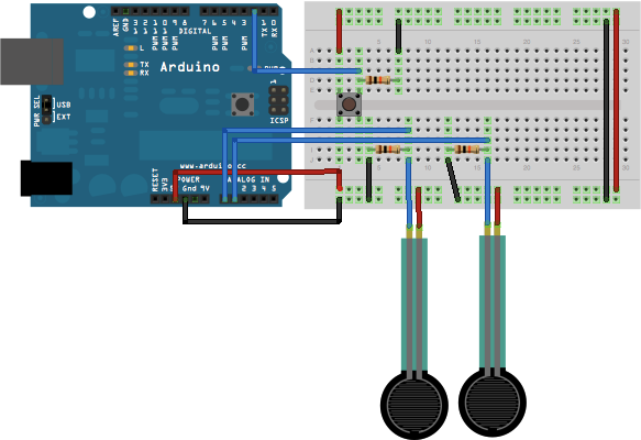 Connect analog sensors to analog input pin 0 and 1 with 10K ohm resistors used as voltage dividers. Connect a pushbutton or switch to digital I/O pin 2 with a 10Kohm resistor as a reference to ground.