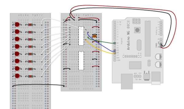 In this example you'll add a second shift register, doubling the number of output pins you have while still using the same number of pins from the Arduino.