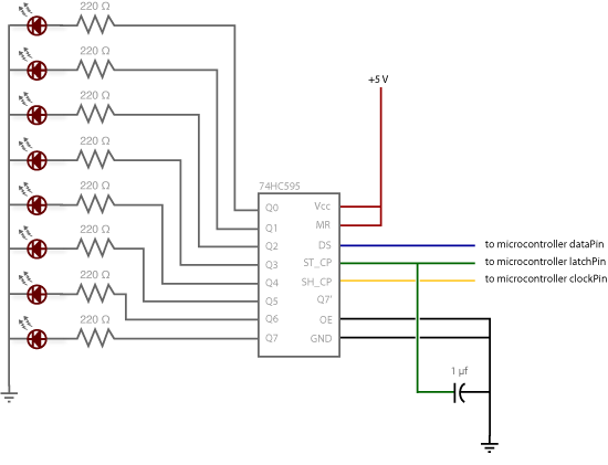 From now on those will be refered to as the dataPin, the clockPin and the latchPin respectively. Notice the 0.1"f capacitor on the latchPin, if you have some flicker when the latch pin pulses you can use a capacitor to even it out.