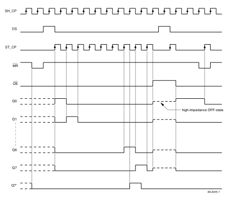 The "serial output" part of this component comes from its extra pin which can pass the serial information received from the microcontroller out again unchanged. This means you can transmit 16 bits in a row (2 bytes) and the first 8 will flow through the first register into the second register and be expressed there. You can learn to do that from the second example.