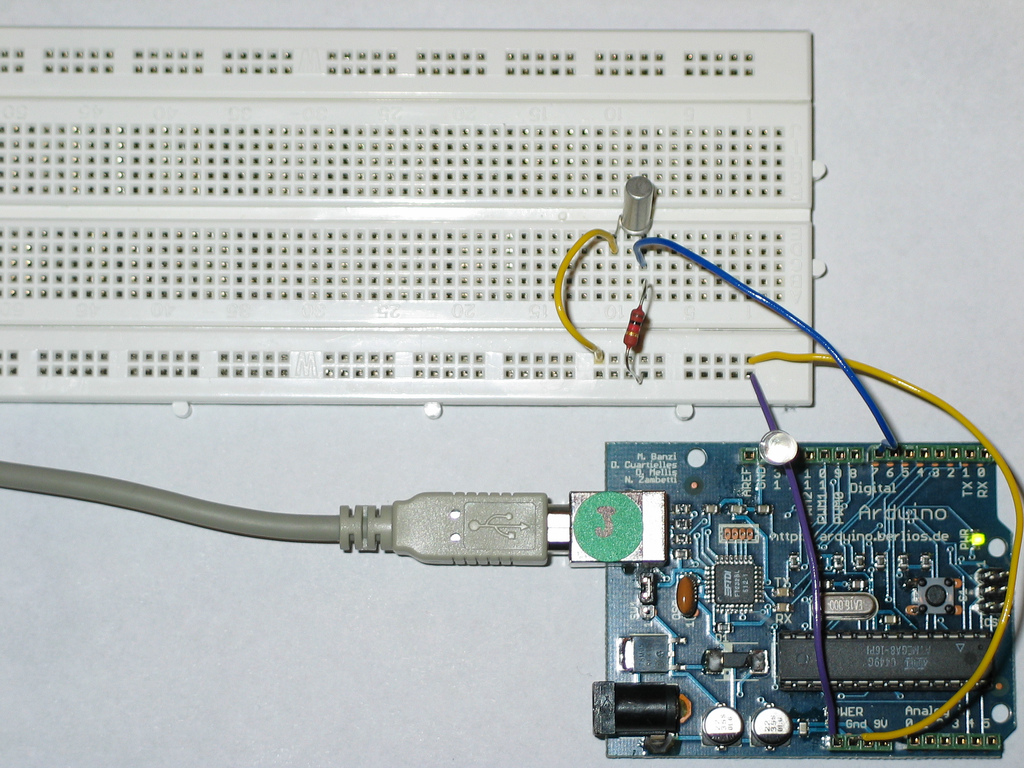 The prototyping board has been populated with a 1K resitor to make the pull-up and the sensor itself. We have chosen the tilt sensor from Assemtech, which datasheet can be found here. The hardware was mounted and photographed by Anders Gran, the software comes from the basic Arduino examples.