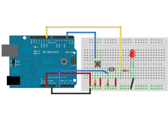 In the main loop, the sketch below reads the value of a photoresistor on analog pin 0 and uses it to fade an LED on pin 9. But while a button attached to digital pin 2 is pressed, the program runs a method called calibrate() that looks for the highest and lowest values of the analog sensor. When you release the button, the sketch continues with the main loop.