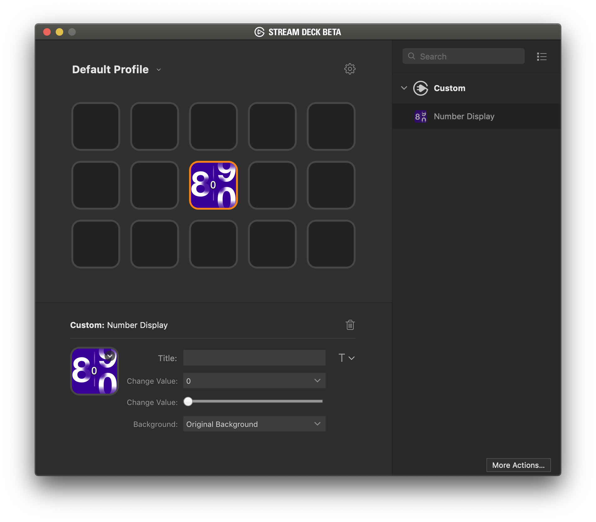 NumberDisplay is a plugin that displays a number chosen by the user. This plugin demonstrates how to create a custom Property Inspector and how to pass values from Property Inspector's input controls to the plugin.