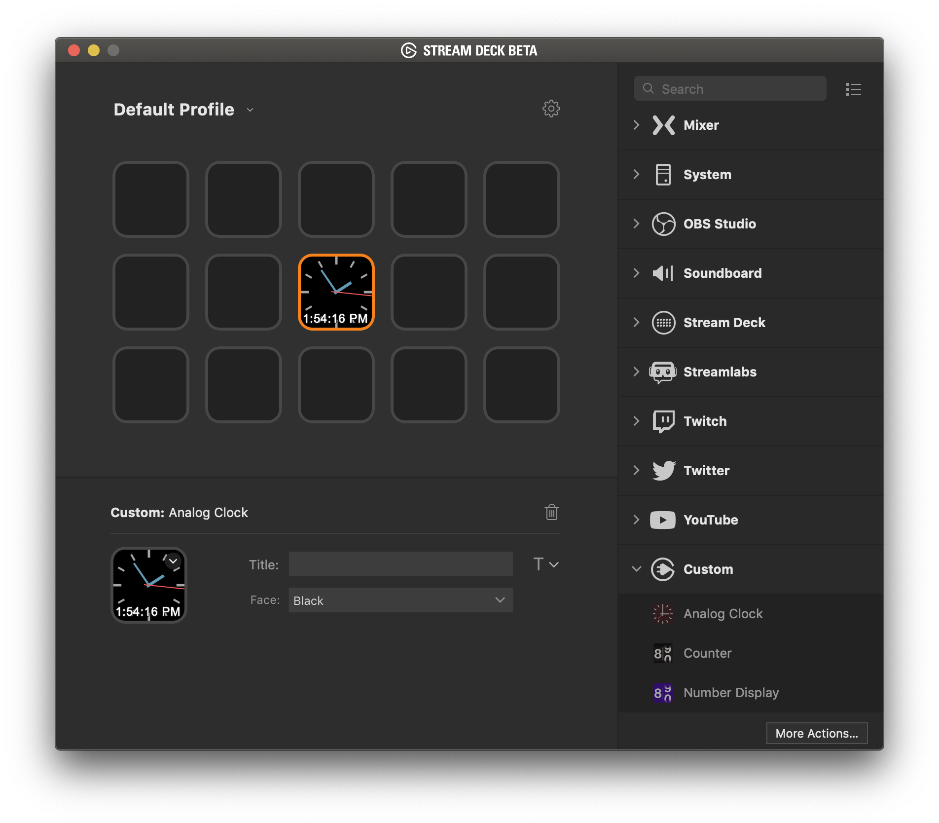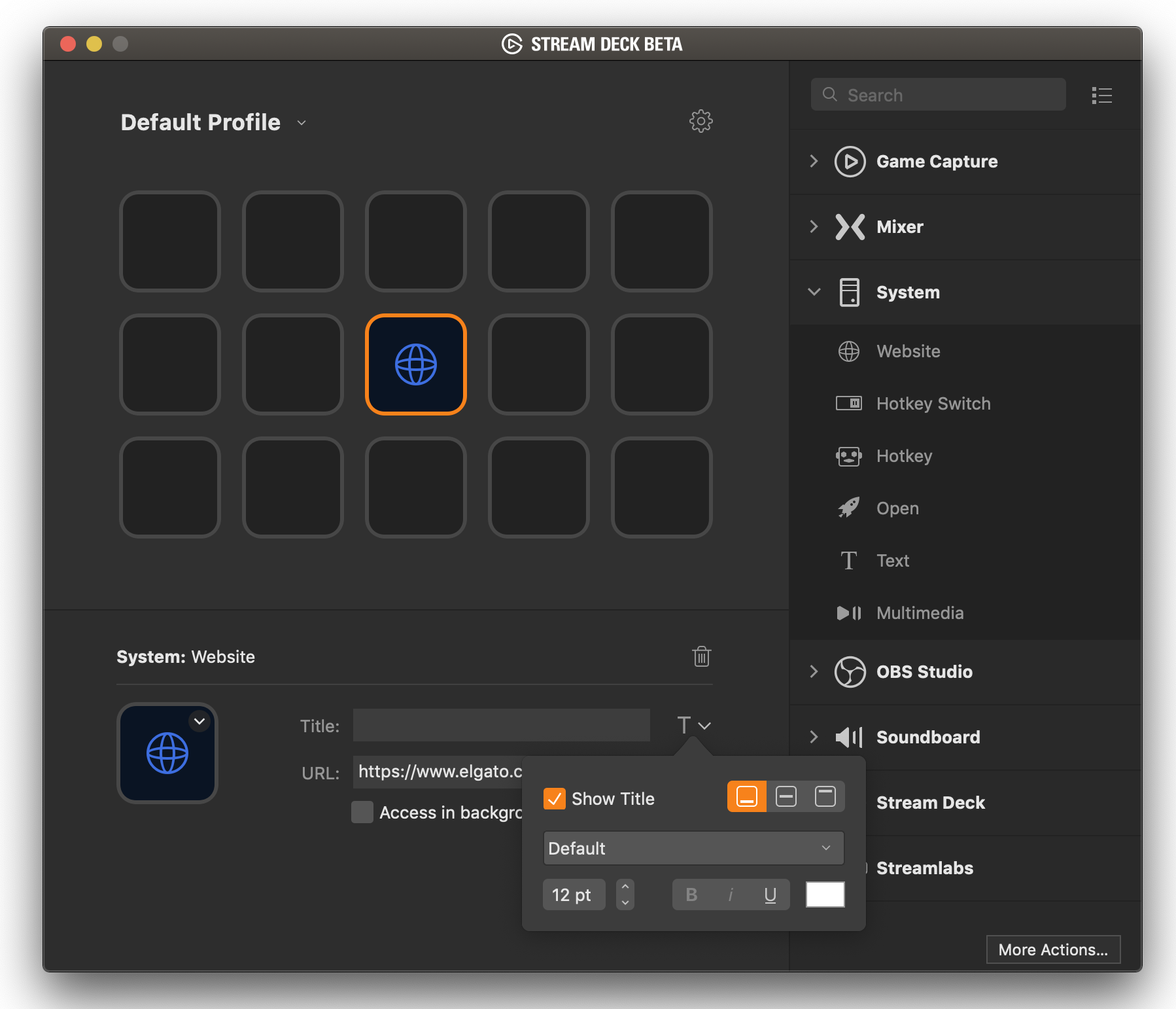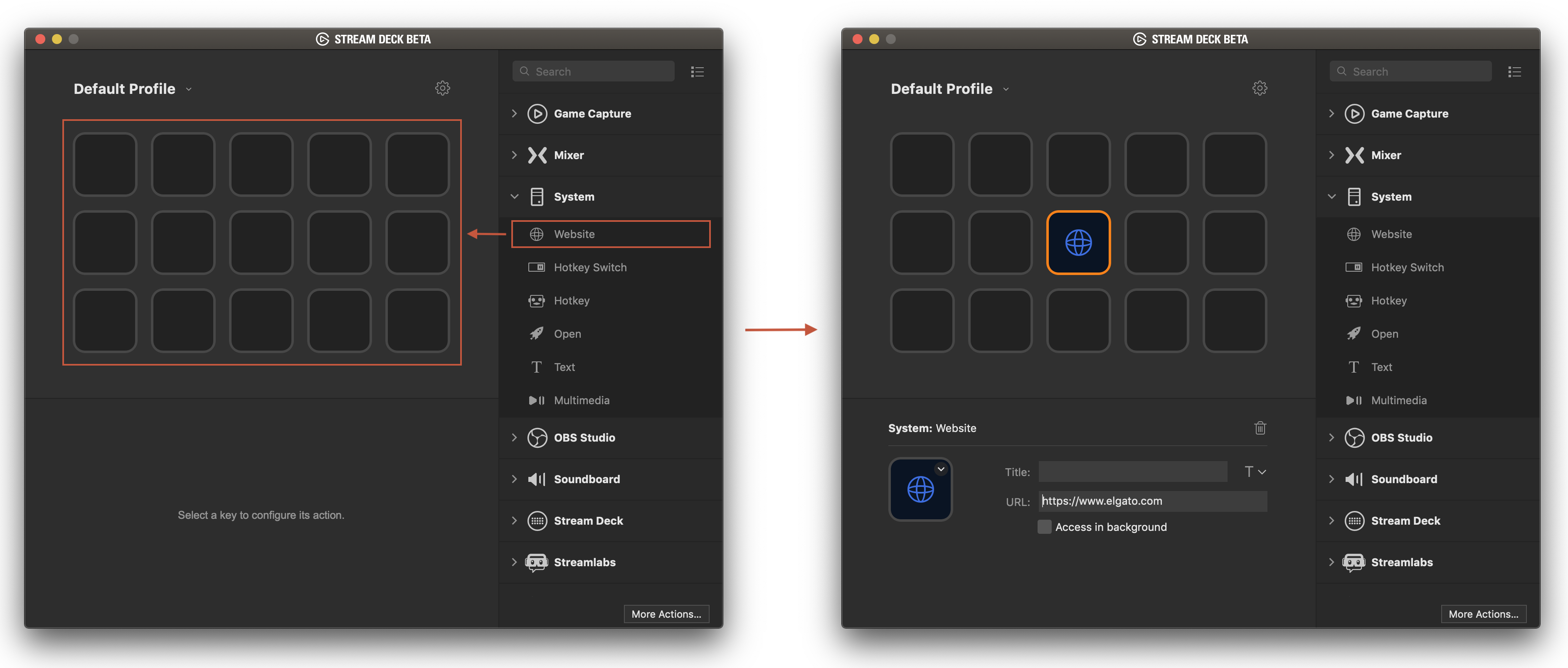 Adding powerful actions to the canvas in Stream Deck is as easy as drag and drop thanks to native integrations with popular software and services. Pick an action from the right hand side action list and drag it onto a key in the canvas: