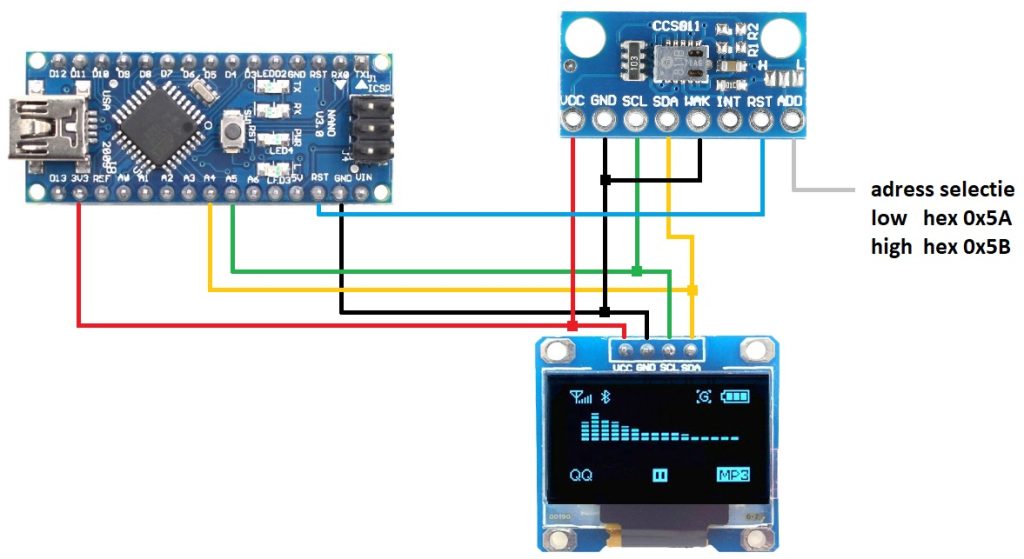 Om adres 5B te gebruiken, pas pin ADDR aan door hem aan GND te leggen of pas het statement .begin() aan (myCCS811.begin(0x5B))