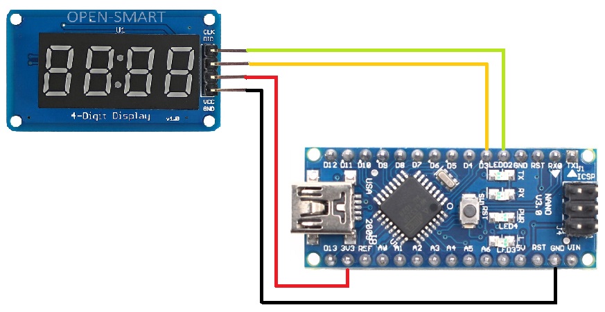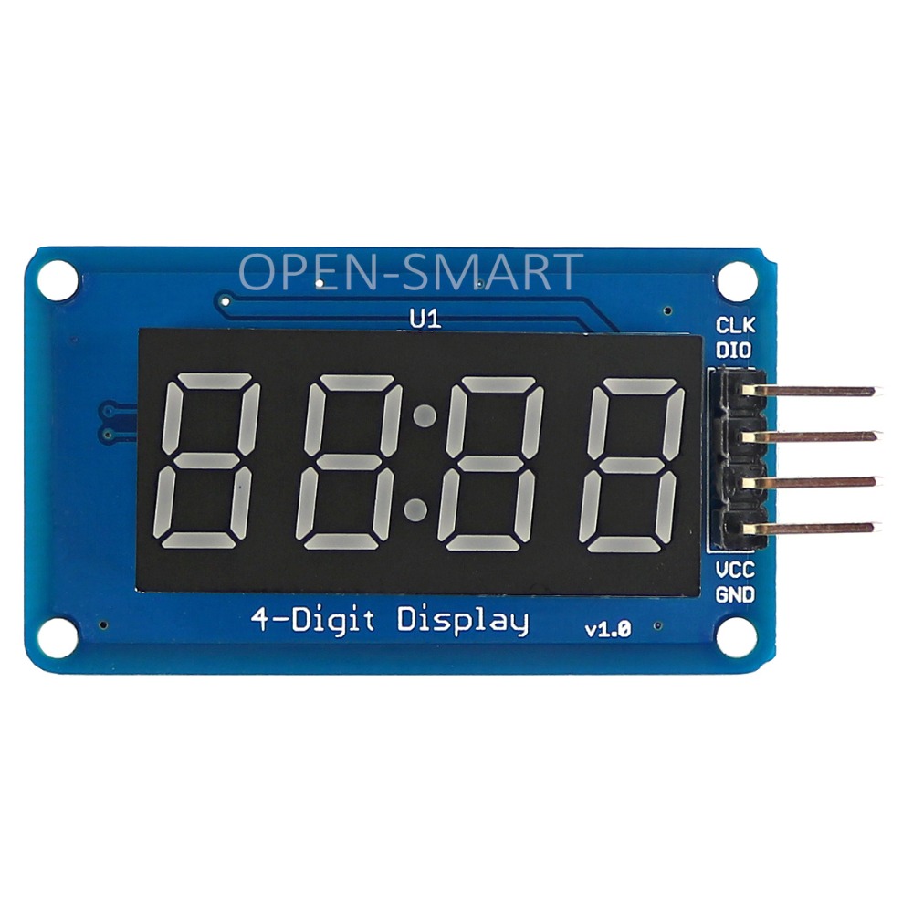 4 Digit klok display module met 4 rode common anodes en dubbele punt. Aangestuurd door een TM1637 chip, waardoor er maar 2 pinnen nodig zijn om de module aan te sturen.
