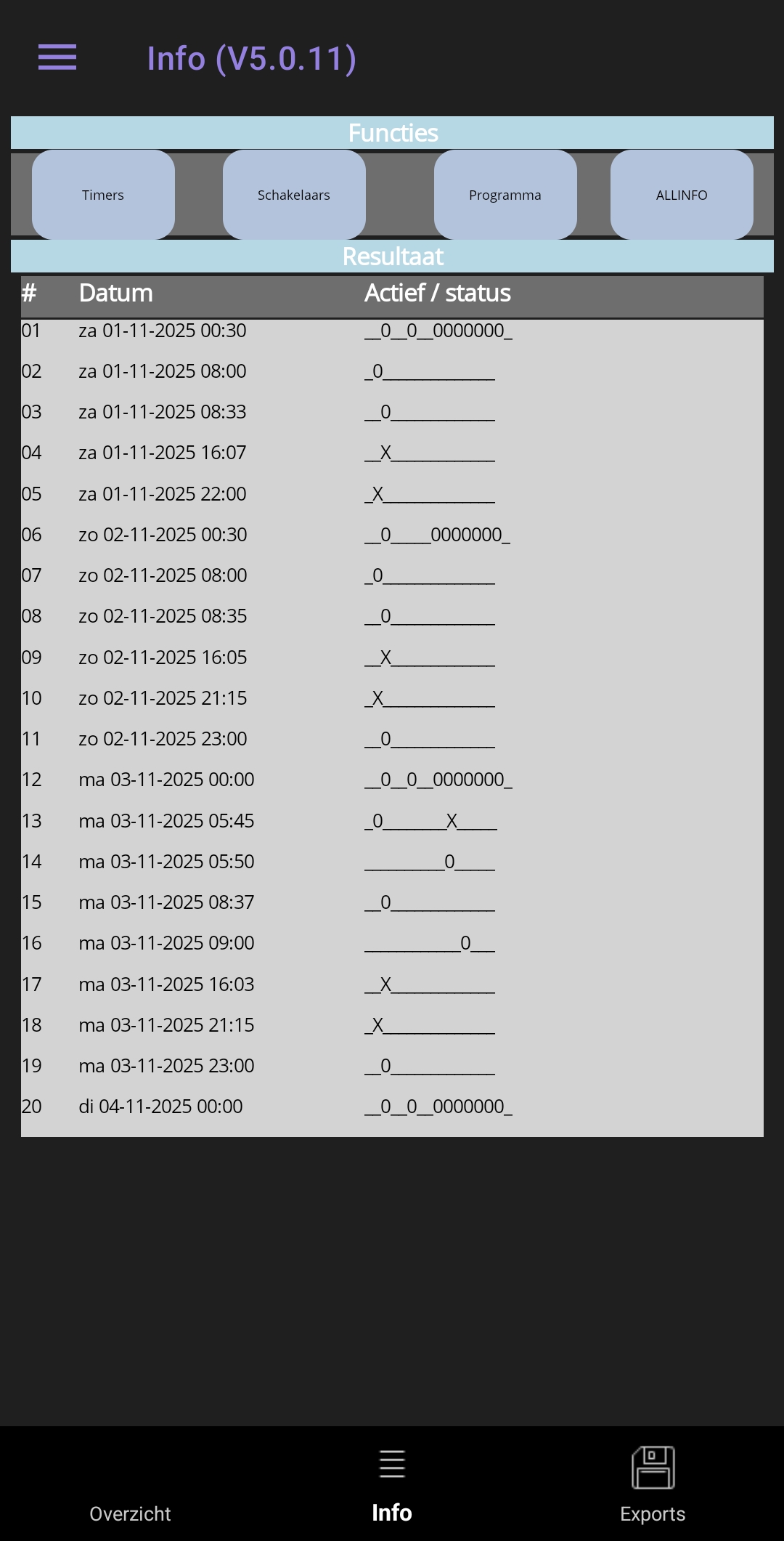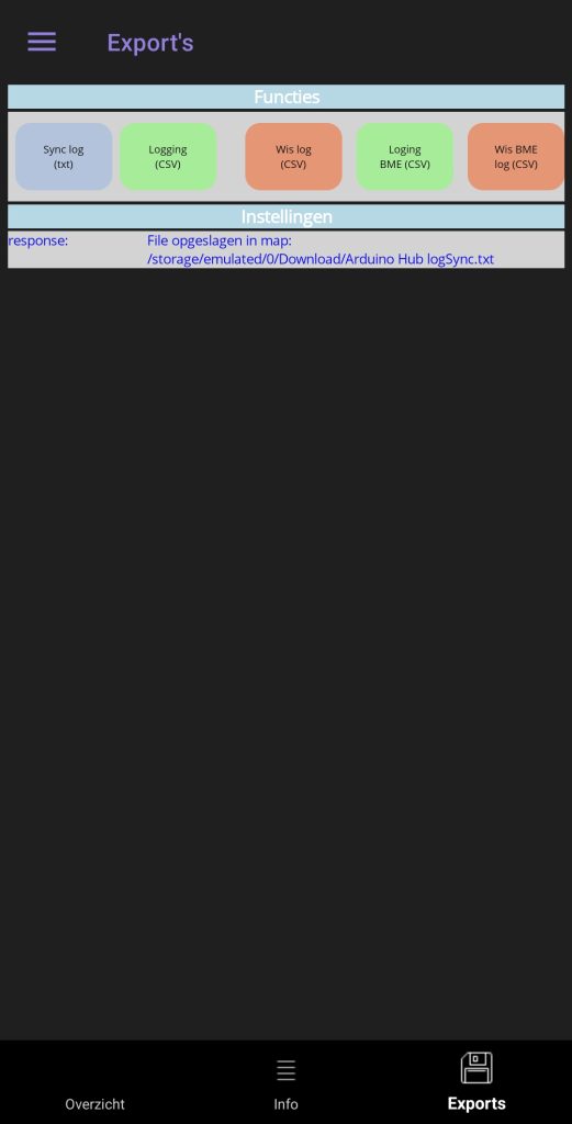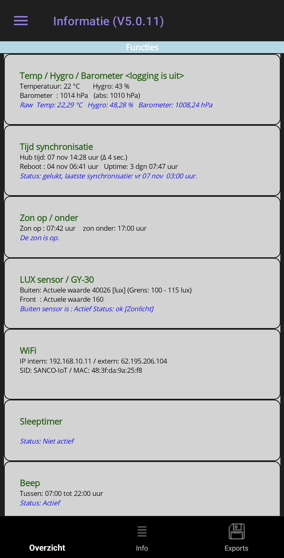 Exports: van Extern IP, Temperatuur hygro en barometer, activiteiten log.