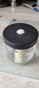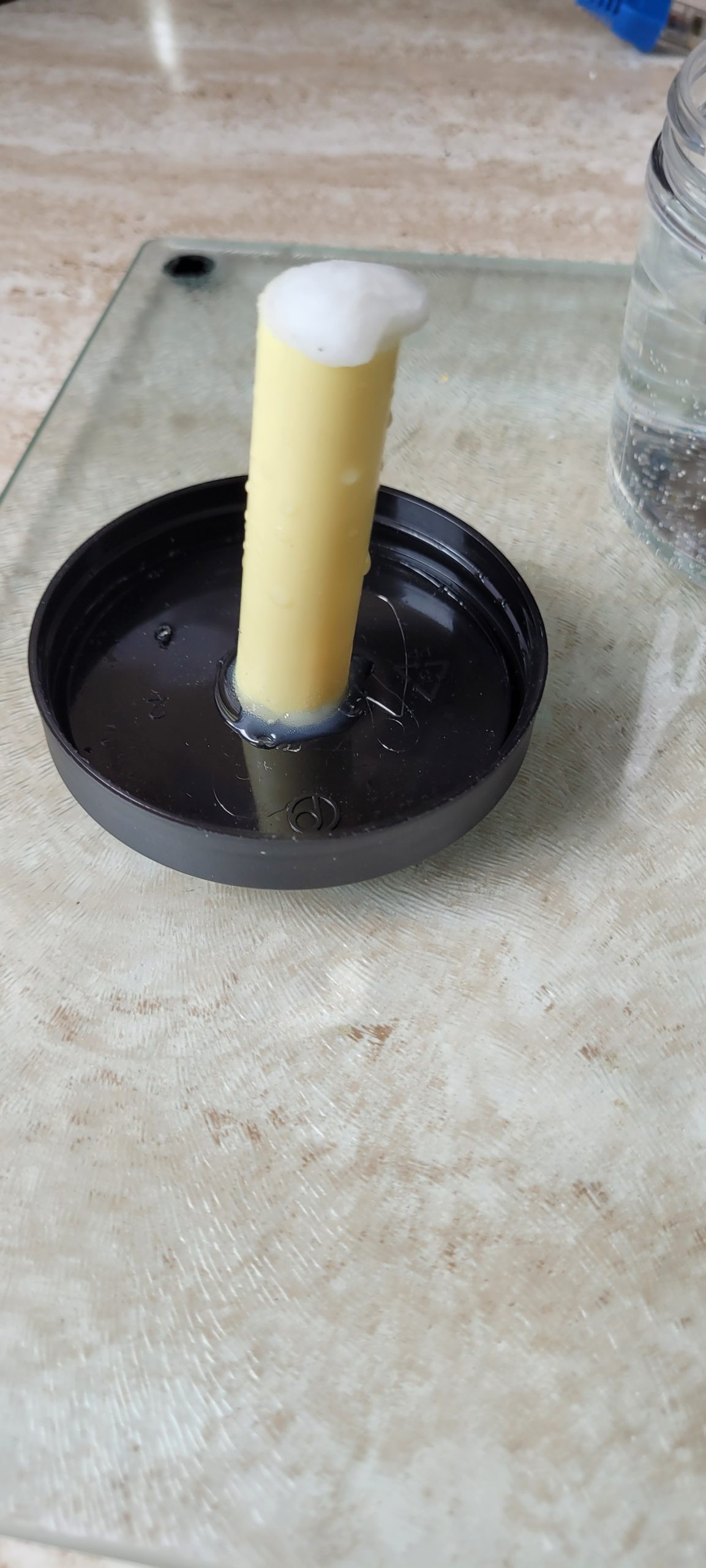 • Maak in de deksel een rond gat waarin de afgezaagde pvc buis komt. Maak tevens een ontluchting gaatje van ca 2 mm.