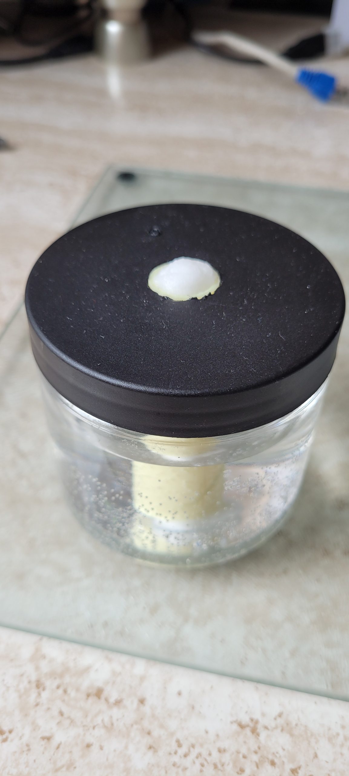 Op de bovenkant moet de watten prop iets eruit komen, zodat het poëtisch element er mee in contact kan komen.