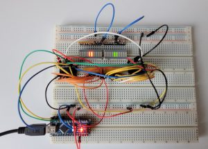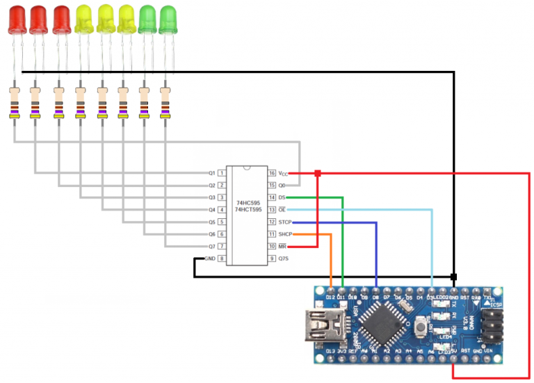 Is de clock voor het schuifregister. De 595 is ‘clock puls’ gestuurd op de als deze Hoog wordt. Dit betekent dat om bits in het schuifregister te schuiven, de clock HOOG moet zijn. En bits worden overgedragen op de stijgende clock puls.