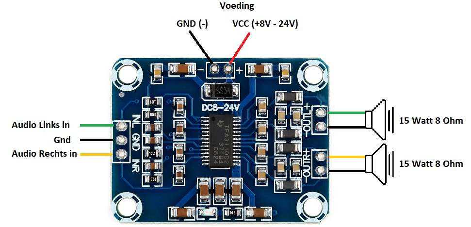 Kleine een eenvoudig te gebruiken stereo versterker, heel algemeen inzetbaar voor allerlei audio projecten.