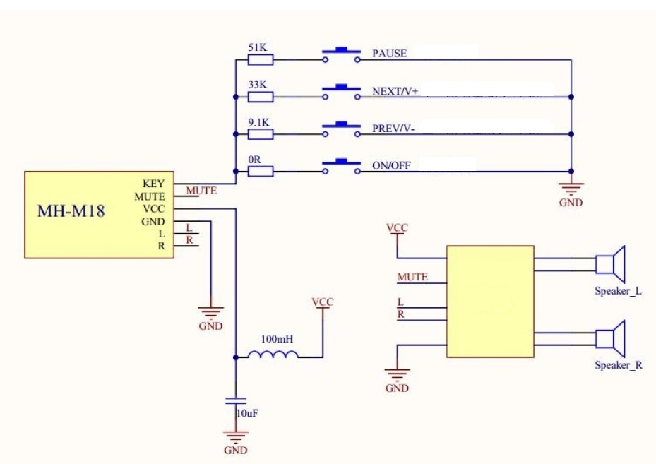 - Key: Functies pin (Pauze, next, prev.,On/Off)