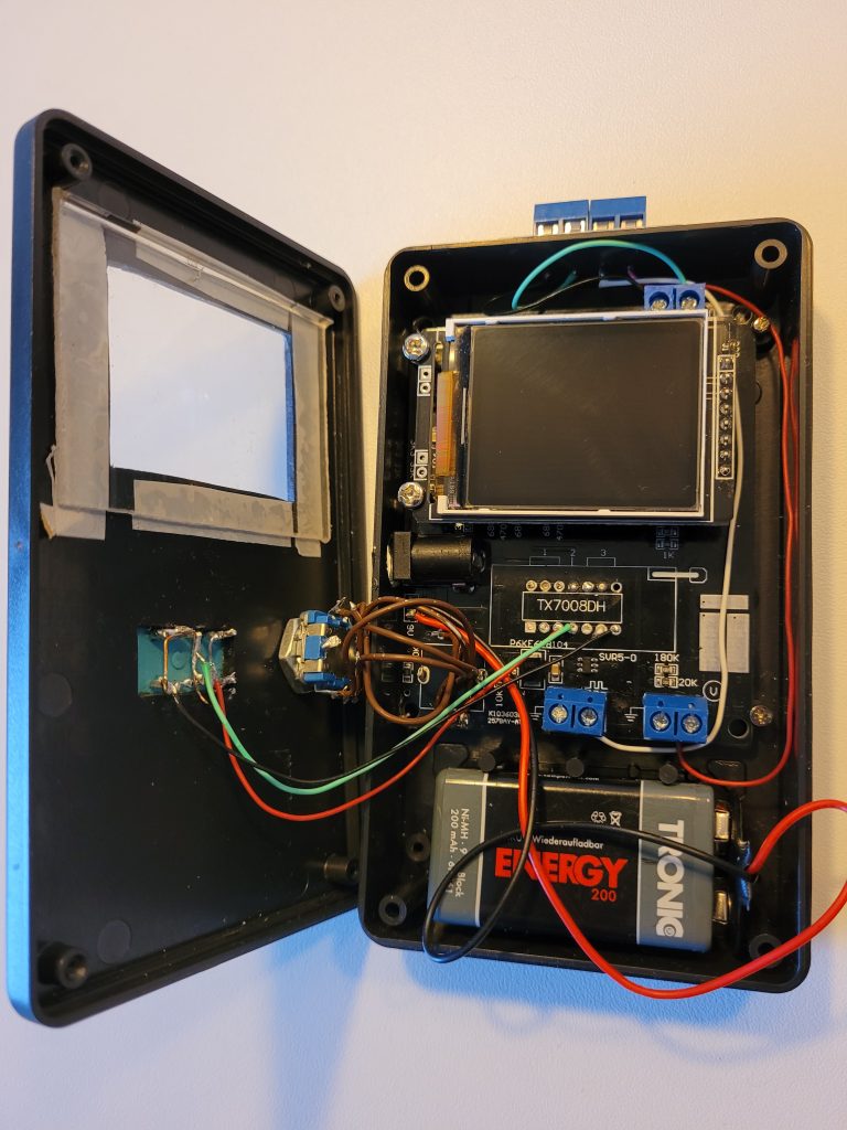 De aansluitingen voor Frequentie en spanning metingen en ook de functie generator zit aan de bovenkant van het doosje.