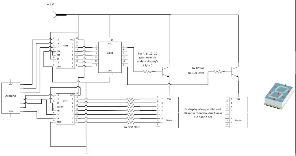 Al een tijd zit ik met de gedachte te spelen om een ‘ouderwets’ LED display aan te sturen met de Arduino. Dit zal dan via multiplexing moeten gaan, een voor een 1 cijfer tonen, dat heel snel achter elkaar zodat het lijkt alsof ze allemaal aanstaan. Ik maak gebruik van een 7447 (7 segment driver IC) en een 74138 (3 line to 8 line decoder) om de 6 display’s aan te sturen met 3 draden. En een hulp IC 7404 (hex inverter), 6 tal NPN transistors en wat weerstanden.