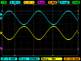 Kanaal 1 / 2 zijn tegen fase. Zie figuur, kanaal 1 is A (blau), kanaal 2 is B (geel)