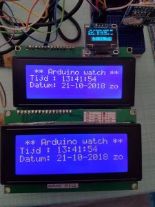 LCD / OLE LED LCD RTC (I2C) voorbeeld programma Omschrijving Toepassing van I2C bus, meerdere modules op 4 draden. (5V, GND en 2 data lijnen) Het projectje bestaat uit de volgende onderdelen:1x Arduino nano1x RTC Clock module1x OLE LED display (128×64) 2x LCD display (20×4)Alle onderdelen worden aangesloten op de I2C bus. (het OLE LED display bevat al 2 pull-up weerstanden, dus deze zijn niet nodig. Schema Downloads Download code voorbeeld: LCD & OLED display demo (0 downloads )
