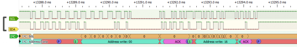 Als je beide lijnen uitleest met een logic analyser, dan ziet dat er zo uit: